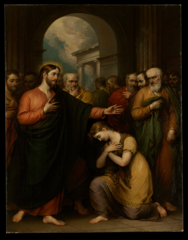 This painting shows the well-known biblical scene of a woman caught in adultery by the Pharisees who pester Christ to condemn her. This woman, rumored to be Mary Magdalene, waits for the condemnation that never comes. Instead, Christ asks the men, “Who among you who is without sin, may cast the first stone?” and the men disperse. [2] Trumbull painted this painting when he was living in England with Harvey and making his living from portraiture. The religious paintings proved a way for Trumbull to stay current with his craft, even if they were not bringing in much money.